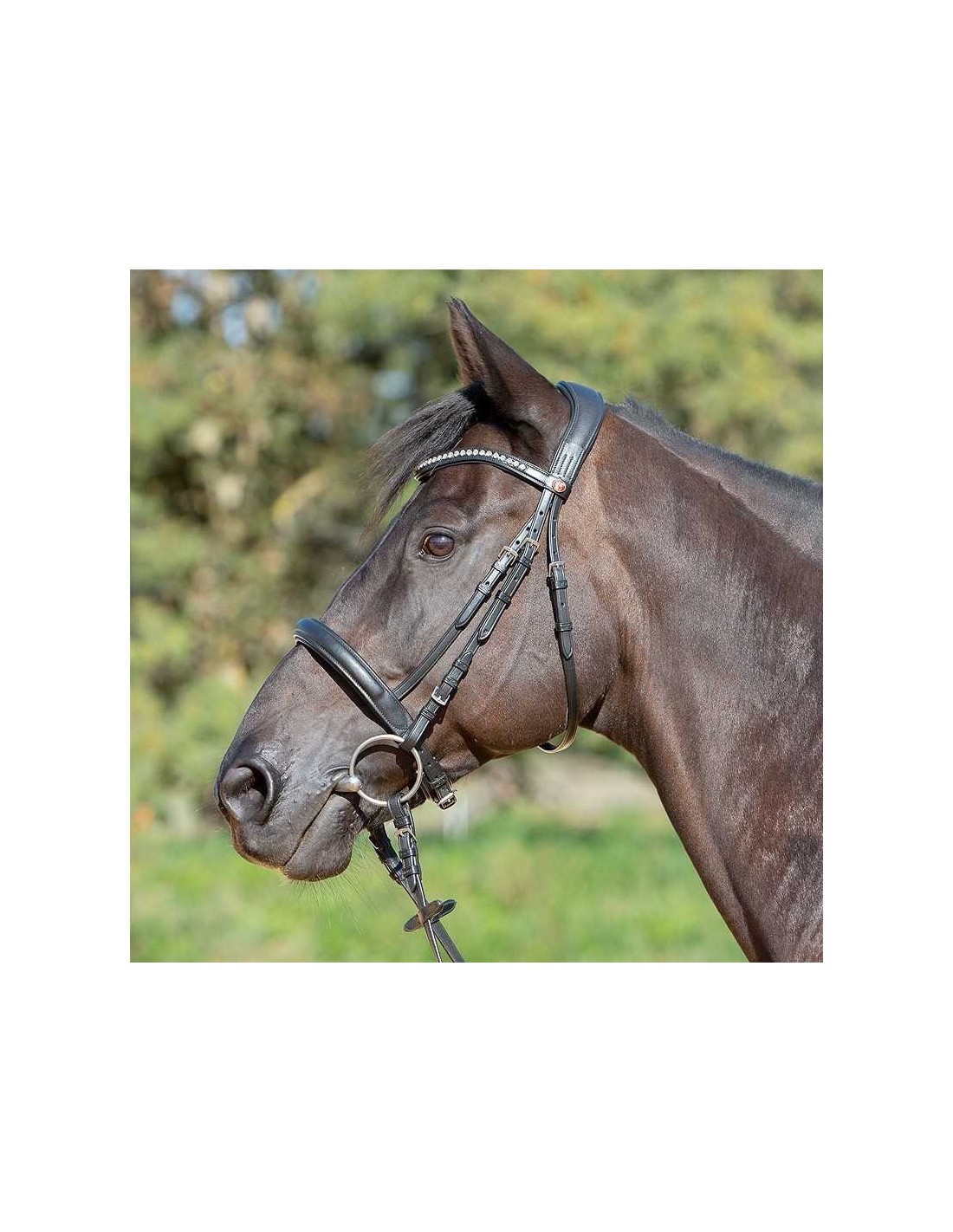 Fabricada en cuero suave de calidad Testero con diseño anatómico. Corte anatómico a la altura de las orejas. Frontalera curva con opción de cuero liso o adornada con cristales blancos o marrón claro. Ancho de la muserola Cob: 32 mm. Ancho de la muserola Full: 35 mm. Hebillas cromadas. Riendas de cinta.